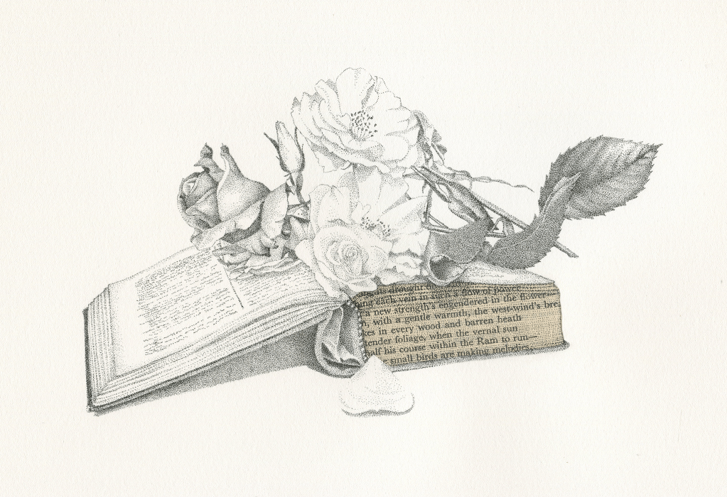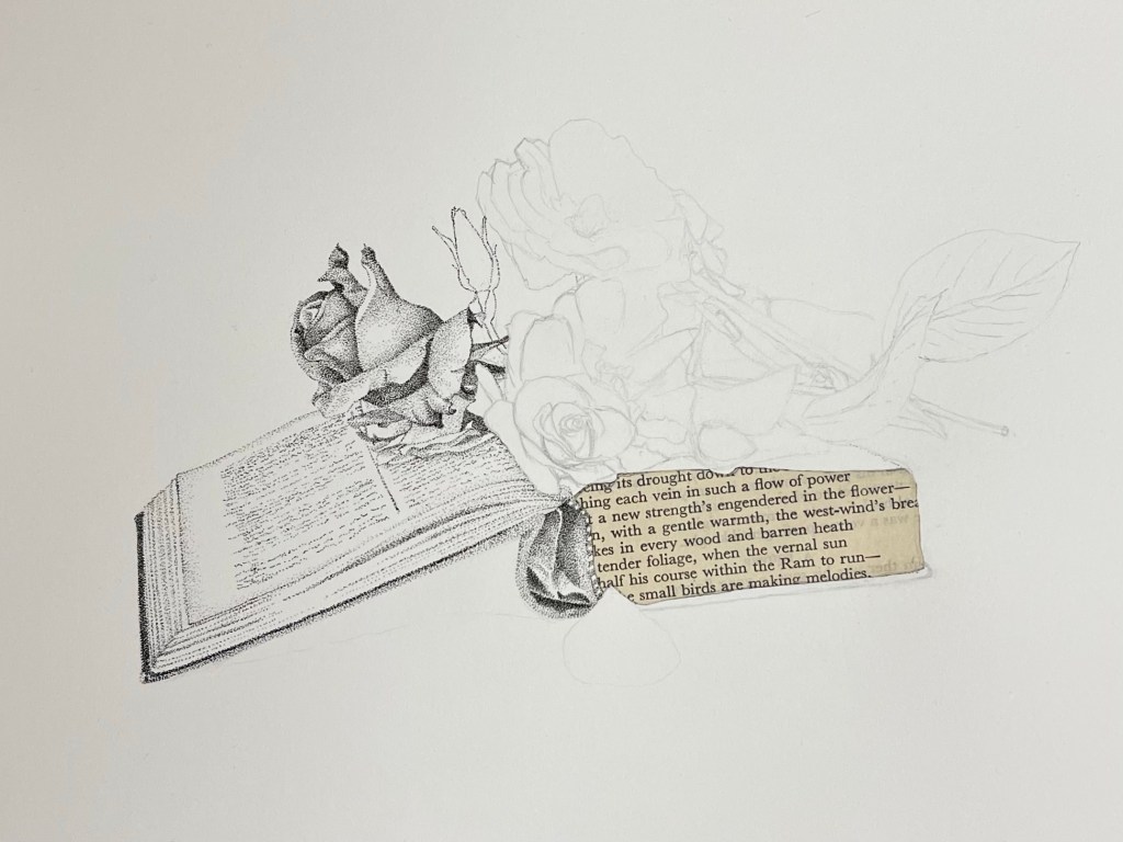 A while back I liked the idea of drawing flowers growing from the centre of a book, so I set up a still life reference for it. It was shoved into my ‘visual diary’ album and pretty much forgotten about.