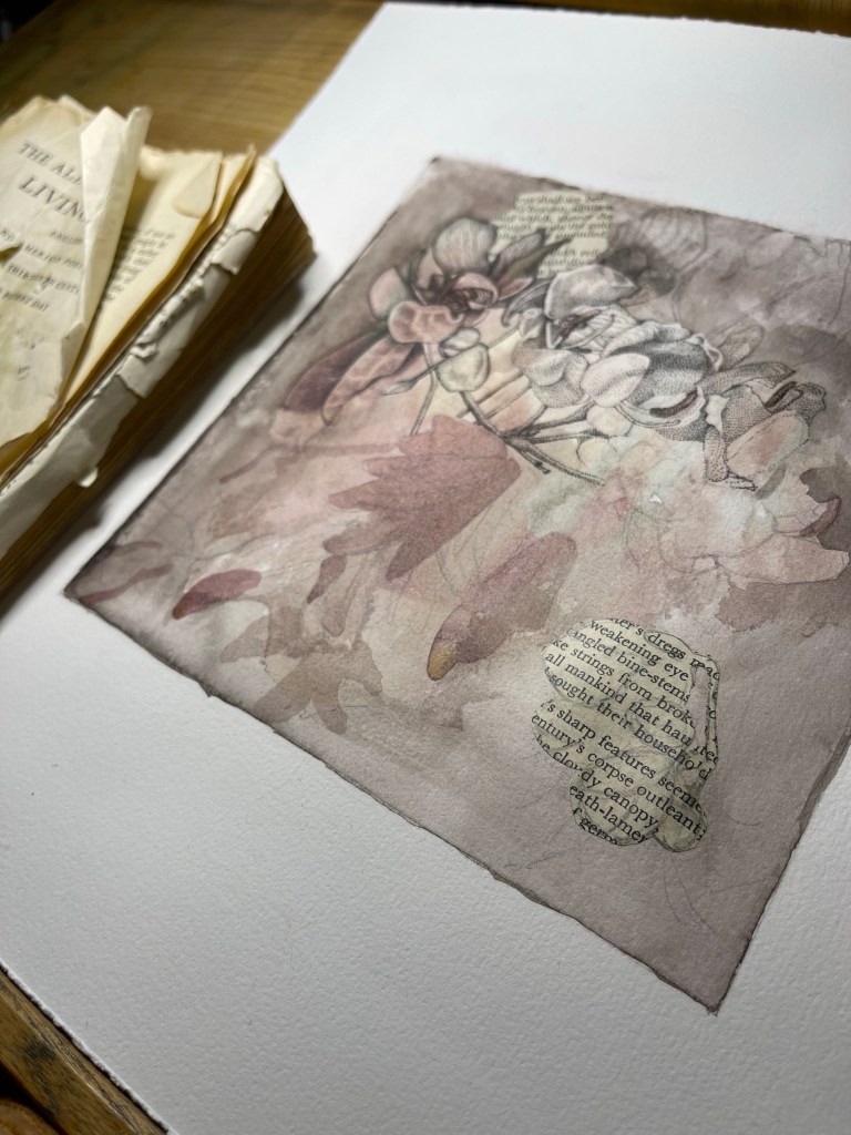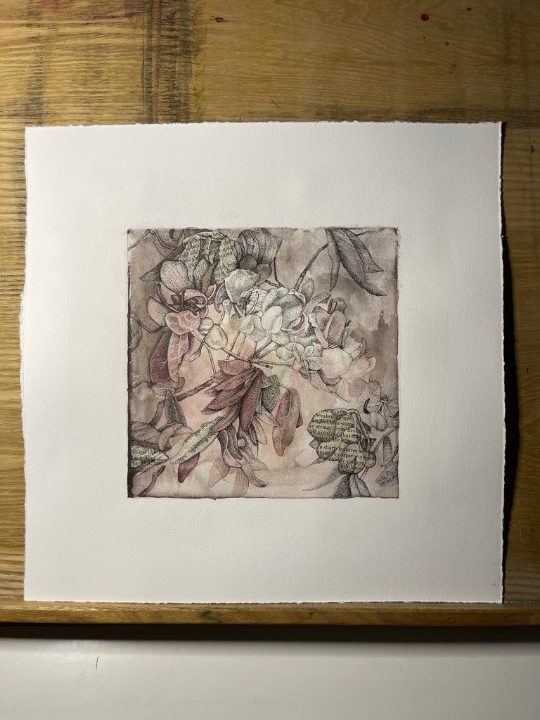 This piece was made when I noticed the turning of the seasons. That first proper glimpse of the colder wet months. This tree has yellow blooms but I really couldn’t budge past pink hues again. The native birds love it, the bugs love it, we love it. Not sure what it’s called unfortunately… our garden is a bit of a mystery.
