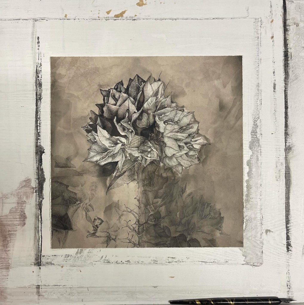 Here’s my latest ink and collage drawing. It’s from the bougainvillea plant, with collage from The Rime of the Ancient Mariner by Samuel Taylor Coleridge.