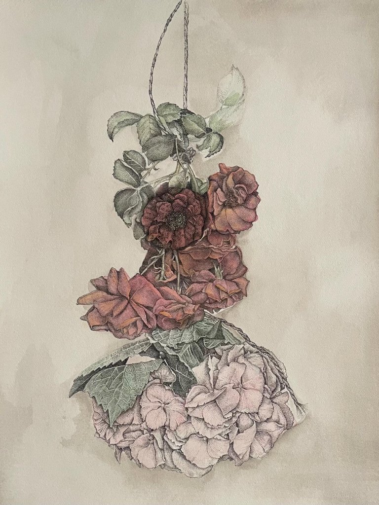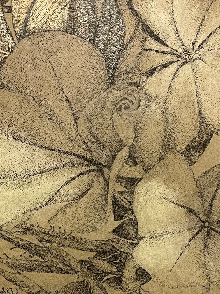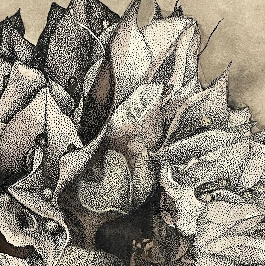 This drawing combines fine ink stippling, delicate watercolour washes, and fragments of vintage text.