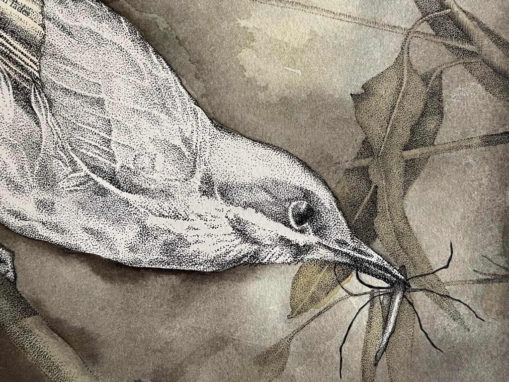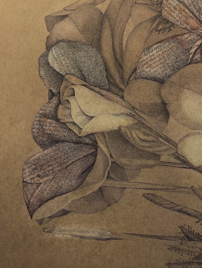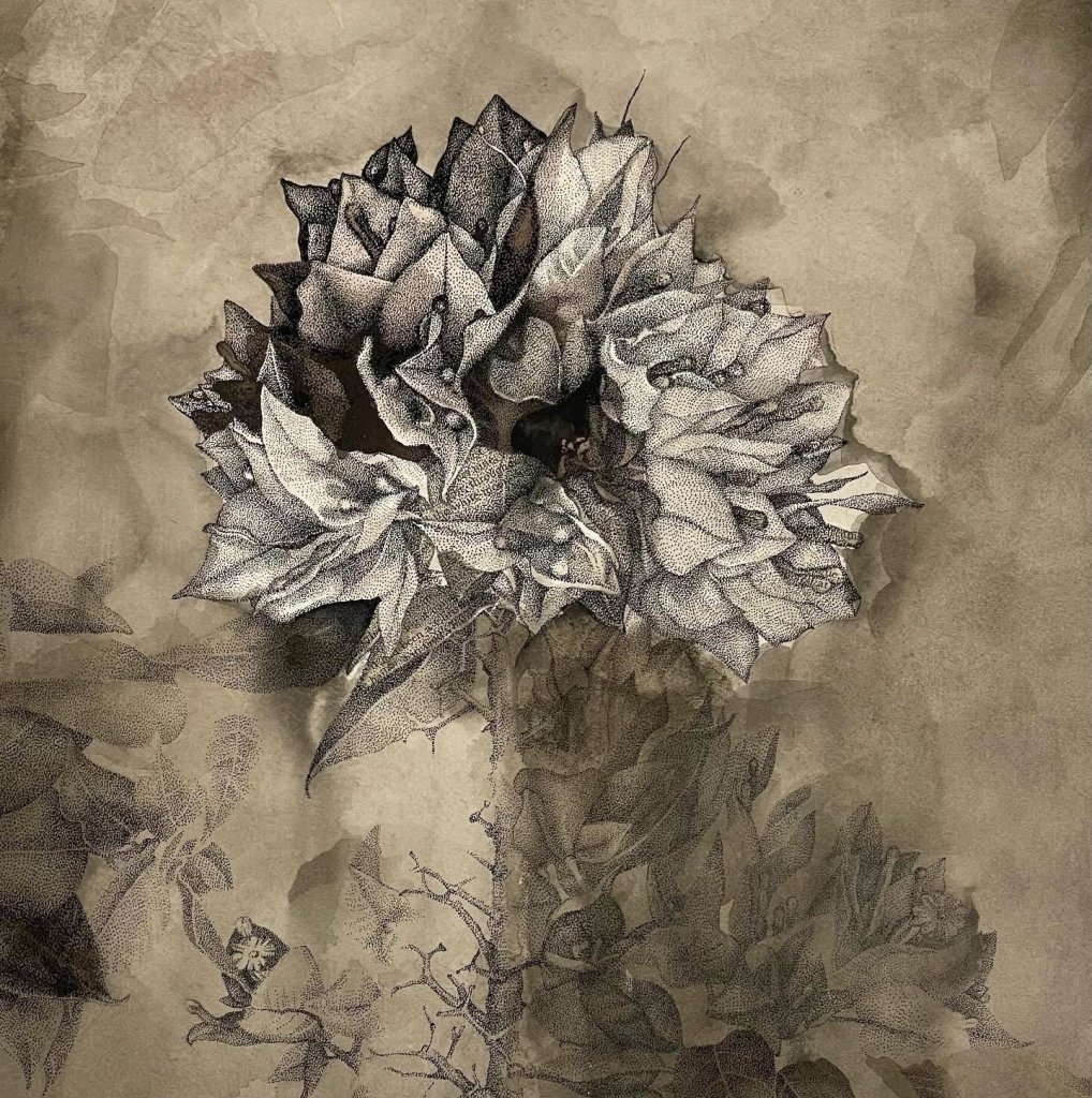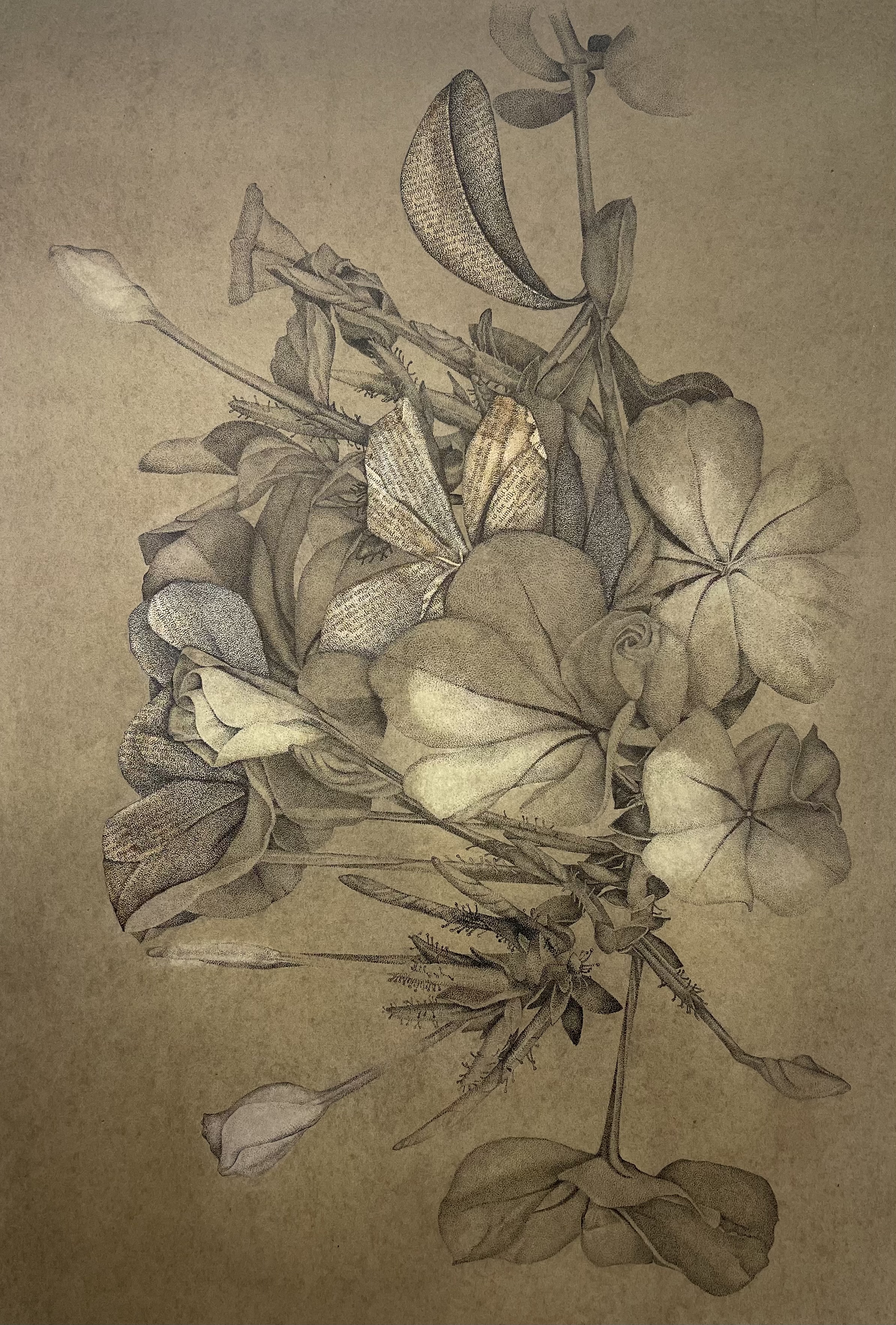 This drawing combines fine ink stippling and cross hatching, delicate watercolour washes, and fragments of vintage text.